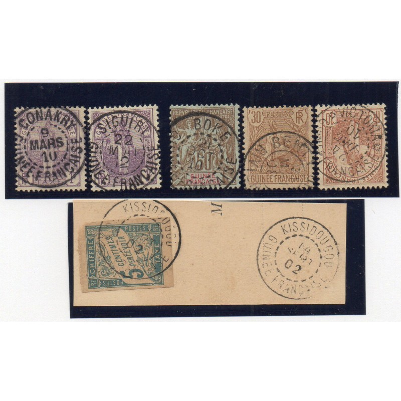 Lot d'oblitérations de Guinée sur types Groupe, et de Kissidougou sur taxe de colonie Générale