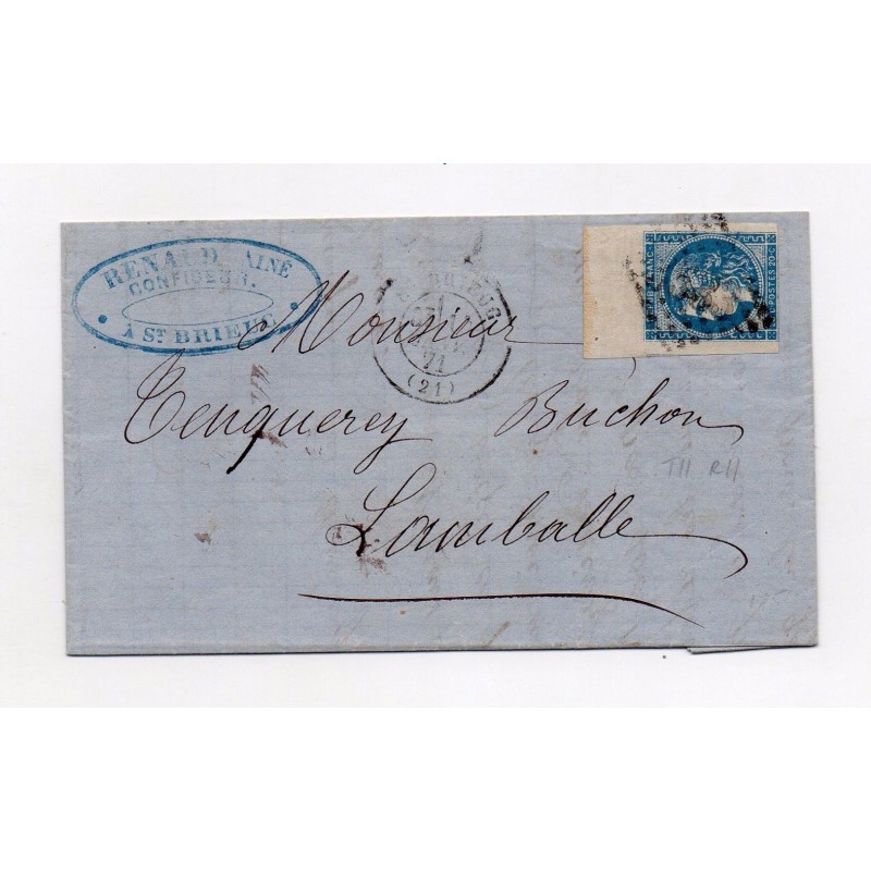 N°45 type II report II grand bord de feuille sur lettre de Saint Brieuc de 1871