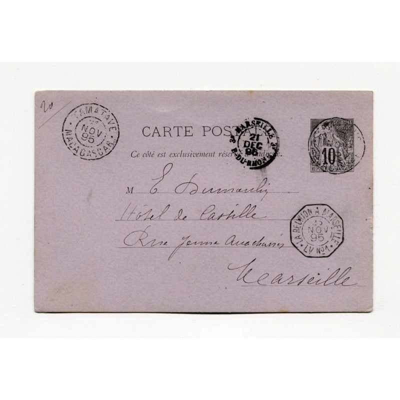 Entier de Tamatave pour Marseille de 1895. Cachet maritime la Réunion à Marseille, LV n°1