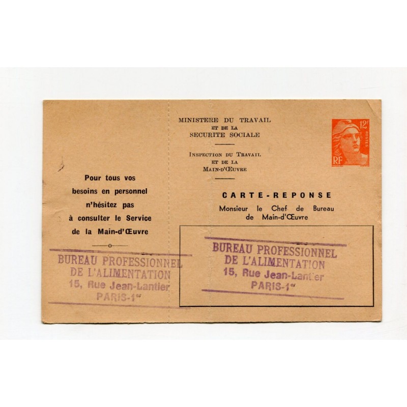 Entier postal 12 F Marianne de Gandon TSC Ministère du Travail et de la Sécurité Sociale, cachet de 1953